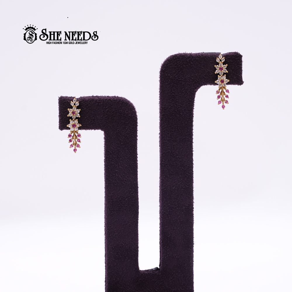 The Blush Bloom Drop Earrings are a dazzling celebration of floral elegance and vibrant pink hues. Featuring a gold-toned floral stud with cascading diamond embellishments, these earrings bring a festive sparkle to any outfit. Whether worn alone or as part of the Rose Radiance set, they make a stunning addition to your jewelry collection.