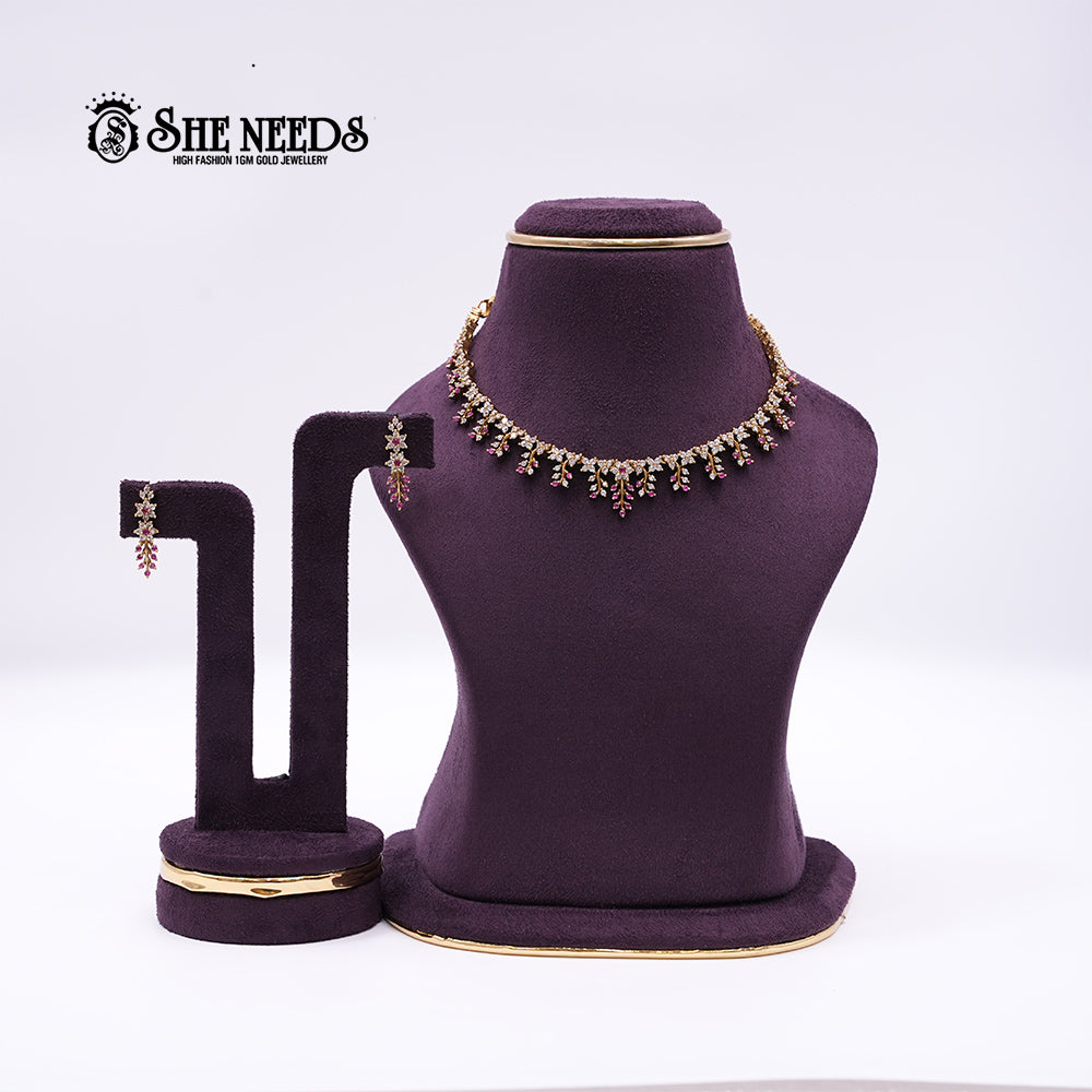 The Rose Radiance Necklace Set from She Needs embodies timeless elegance with a touch of romantic flair. Designed with alternating floral patterns and pink-hued accents, this set exudes sophistication and charm. The drop-shaped pendant adds graceful movement and is adorned with shimmering American diamonds, making it an ideal statement for ethnic wear and festive occasions.