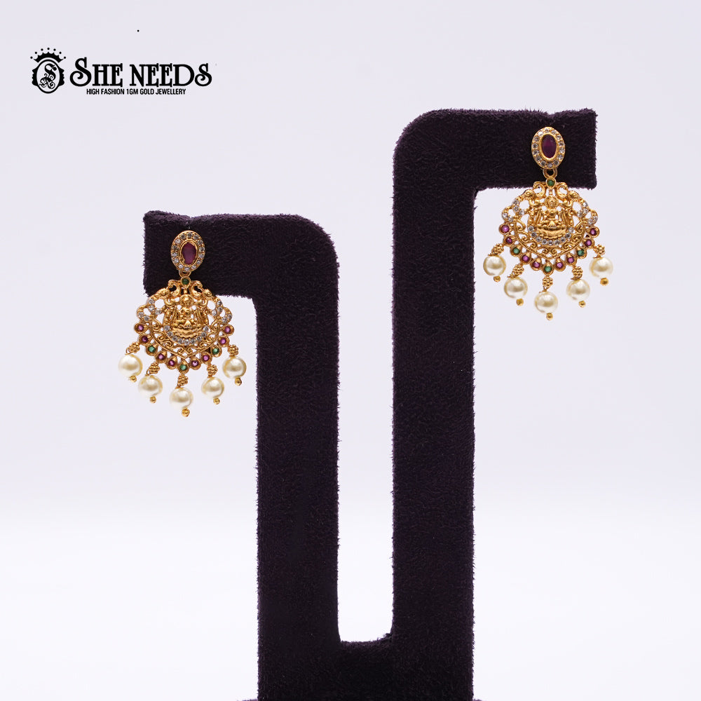 These stunning Temple Design Earrings feature ruby-colored accents, intricate goddess engravings, and delicate pearl drops. Crafted in premium gold-polished alloy, they blend elegance with heritage.