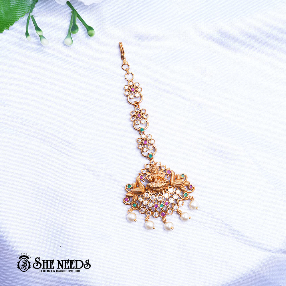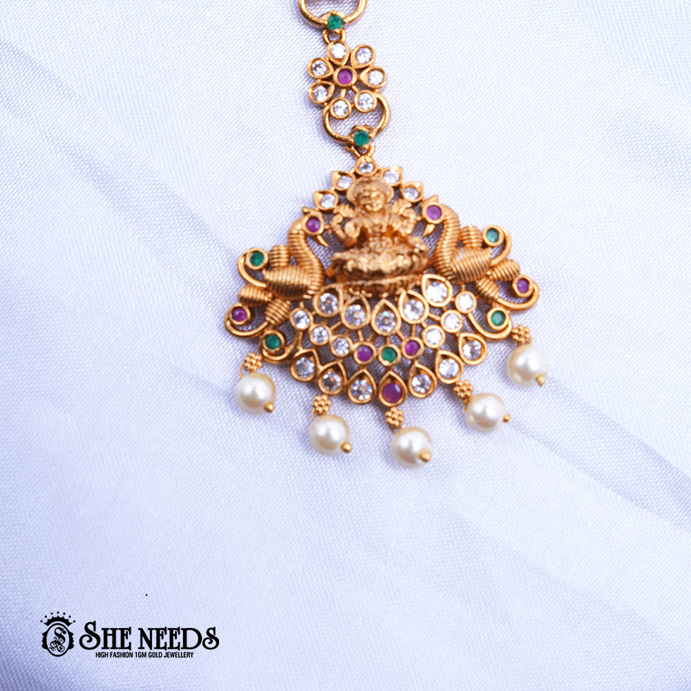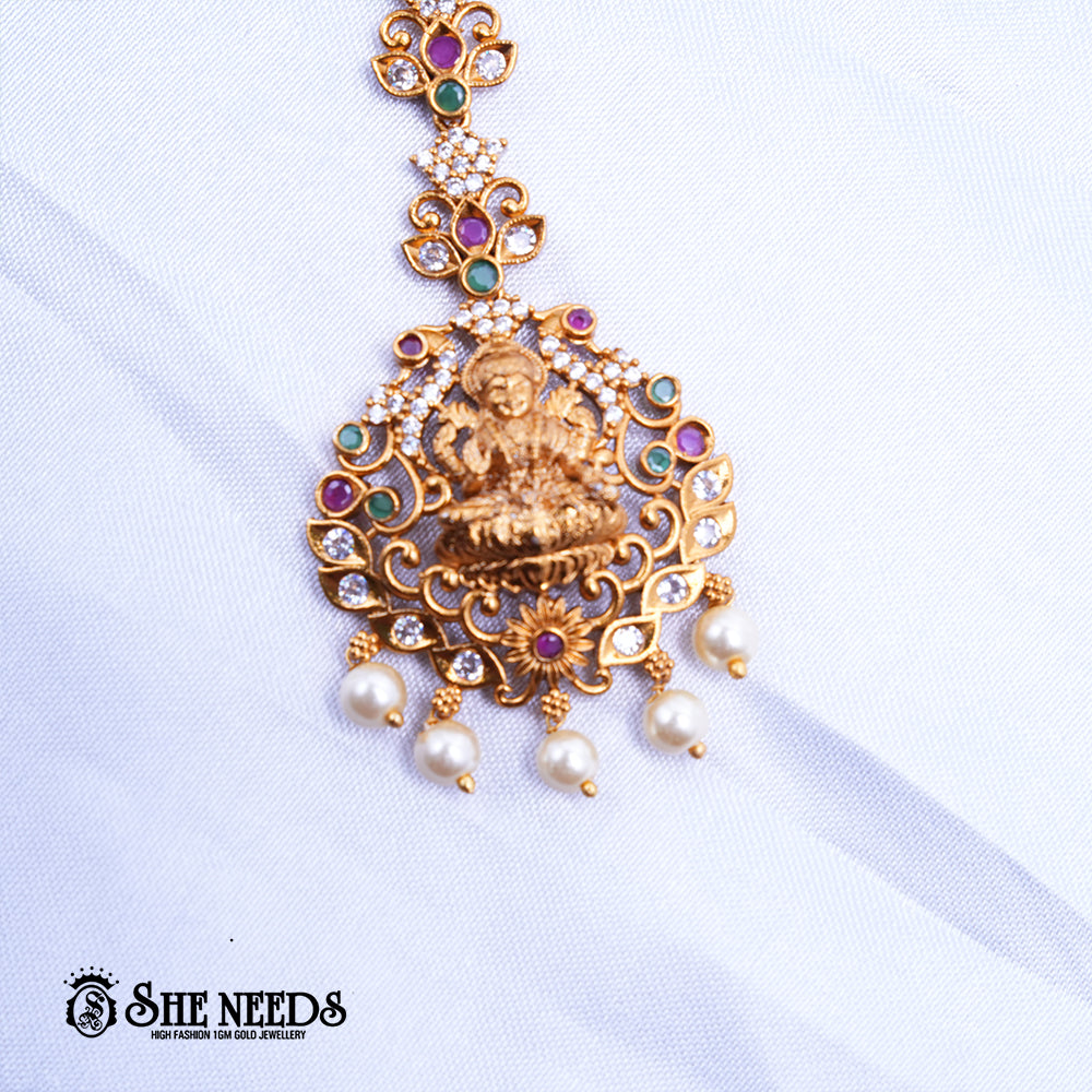 This ornate maang tikka features the iconic image of goddess Lakshmi, set amidst a golden filigree frame with alternating ruby and emerald stones, sparkling CZs, and dangling pearl drops. Embodying temple jewelry opulence, it's designed to elegantly crown any traditional look for weddings and festivals.