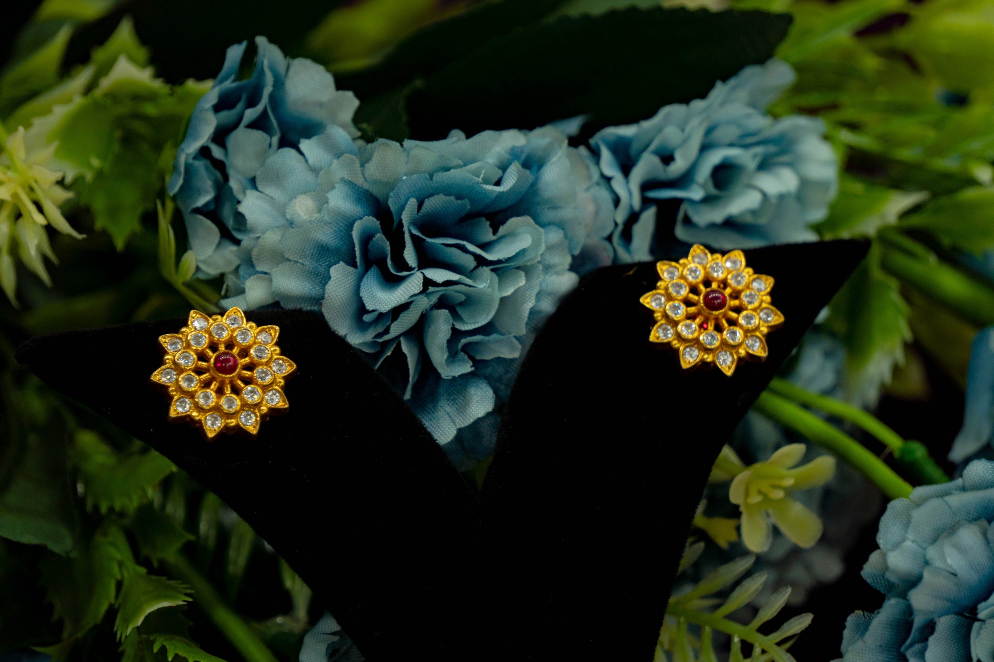 Elegant and timeless, these floral stud earrings are crafted with precision on a sterling silver base and finished in a radiant 1 gram gold polish. Each petal is encrusted with brilliant-cut CZ stones, circling a rich ruby-red center for a regal yet delicate touch. Lightweight and graceful, these studs are ideal for both traditional wear and daily elegance.