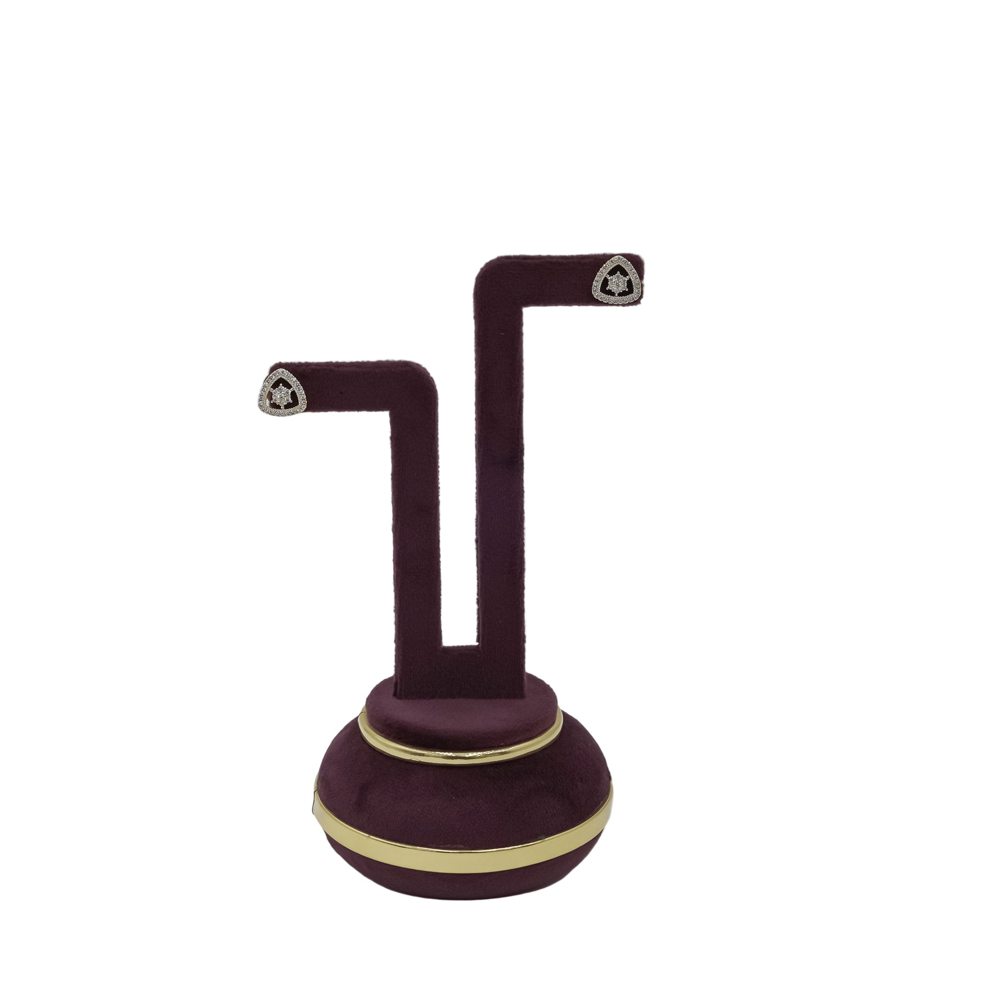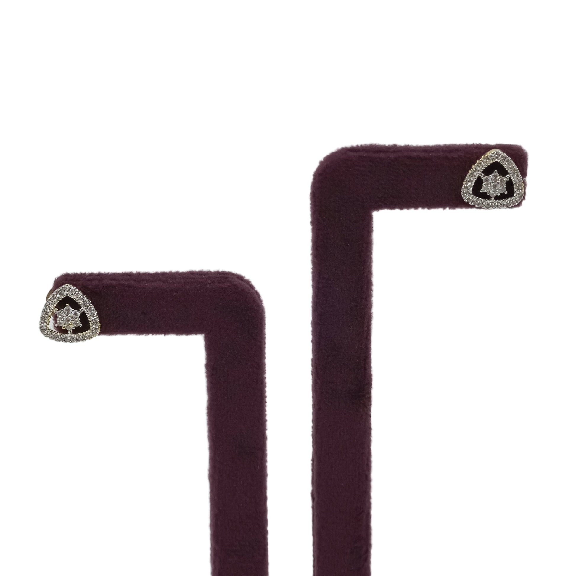 A delicate pair of 1gm gold-plated stud earrings featuring a star-shaped petal motif set in a soft triangular frame. Embellished with shimmering stones, these earrings add a subtle sparkle and charm to traditional and modern ensembles alike.