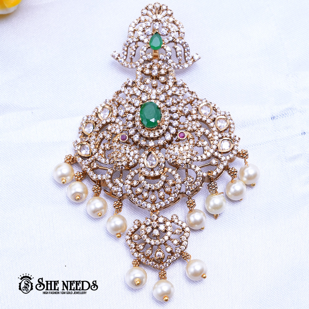 This classic brooch radiates grandeur with its ornate temple-inspired design, dazzling kundan and pave CZ work, and prominent oval emerald centerpiece. Graceful floral filigree, classic pearl hangings, and a layered lower pendant create an aura of rich bridal opulence and vintage charm.
