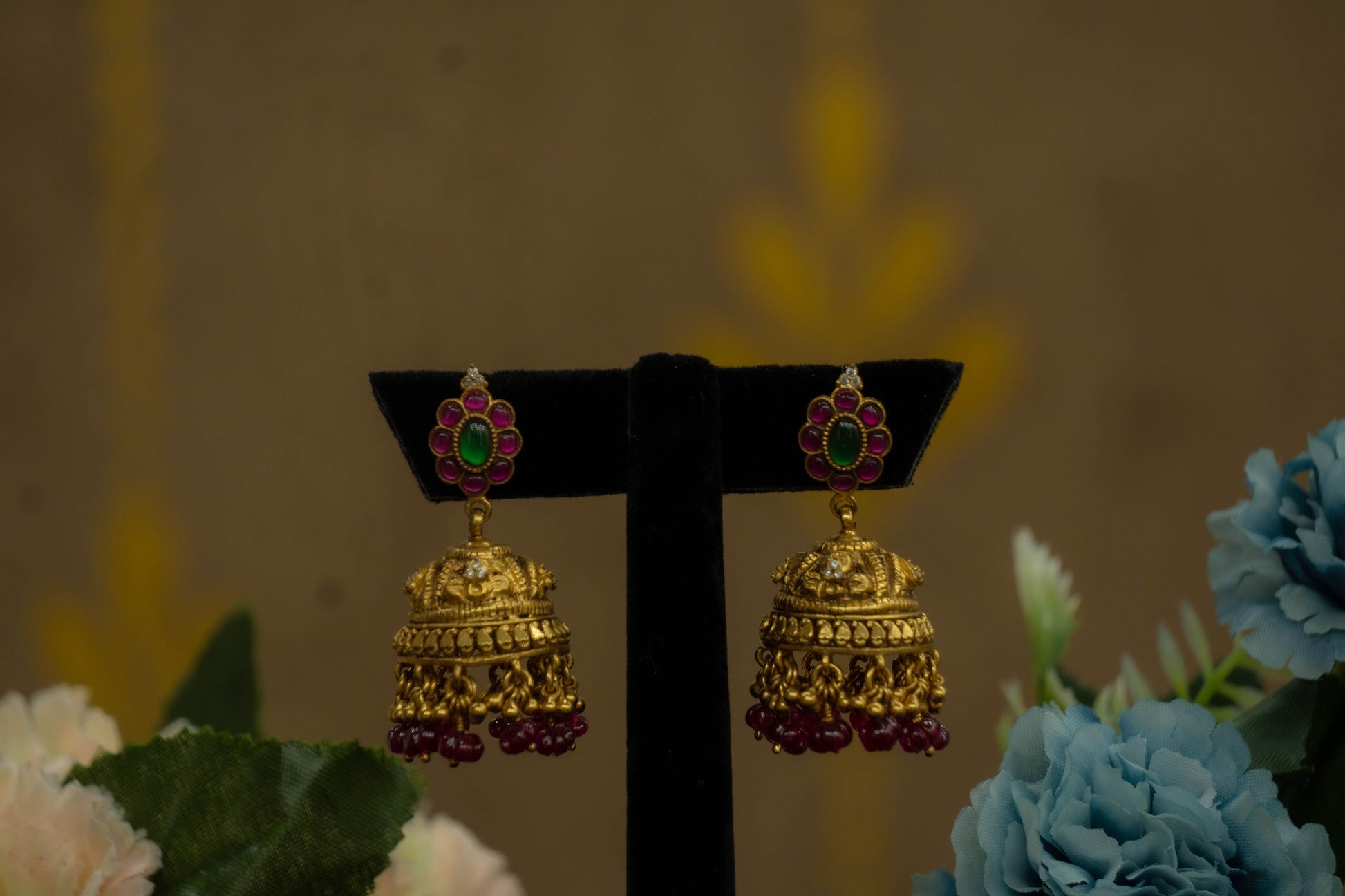 Elevate your ethnic ensemble with these intricately handcrafted temple-style jhumka earrings. Featuring a divine Lakshmi motif in antique gold tone, the design is enhanced with a floral stud top adorned with green and magenta kundan stones. The jhumka base is richly decorated with dangling ruby-toned beads that add graceful movement and vibrant charm.