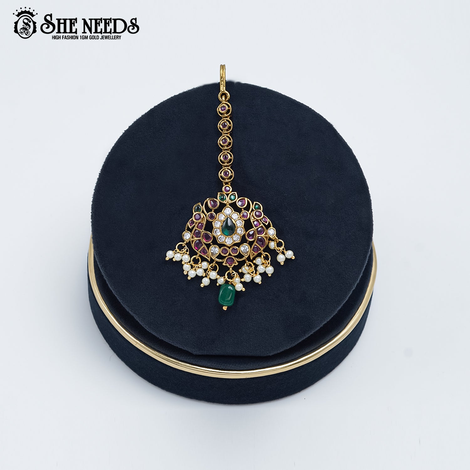 This Regal Polki Tika is an elegant blend of tradition and luxury. Crafted with a gold finish, it features dazzling Polki stones, highlighted with emerald green and ruby red accents. The intricate design is enhanced with delicate dangling pearls, making it the perfect headpiece for brides, festive occasions, or cultural celebrations.