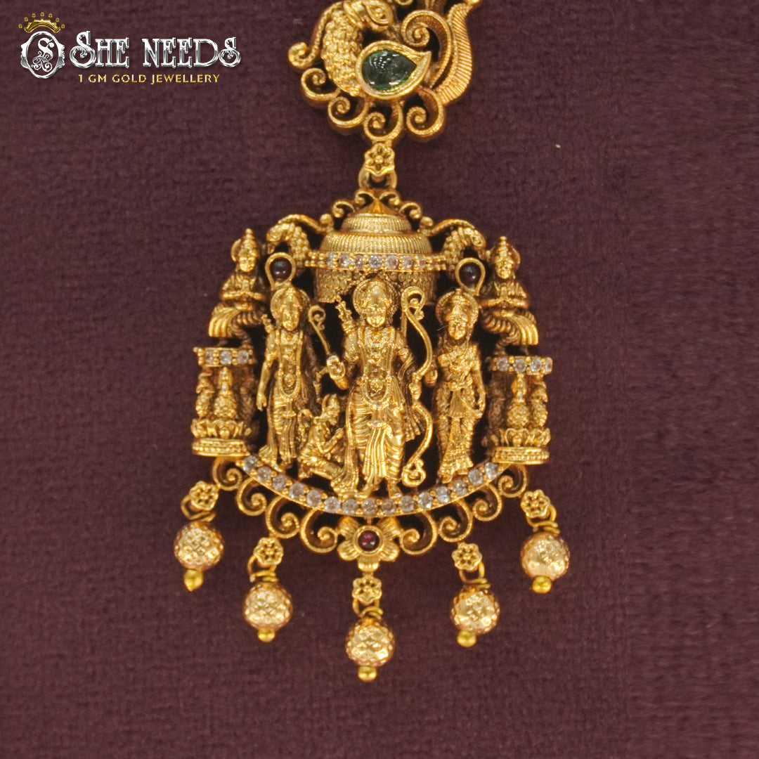 Crafted with divine elegance and cultural significance, the Divine Ayodhya Heritage Pendant is a regal tribute to Indian mythology and heritage. Showcasing Lord Rama, Sita, Lakshmana, and Hanuman in a temple-style motif, this antique gold-finish pendant radiates spiritual richness and artistic grandeur. Ideal for traditional functions, weddings, or religious festivities, it brings timeless beauty and devotion together.