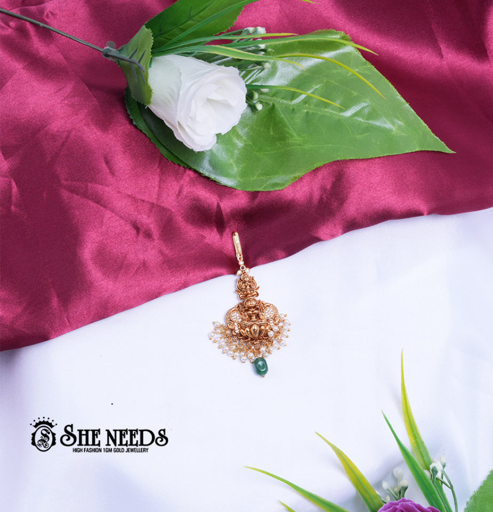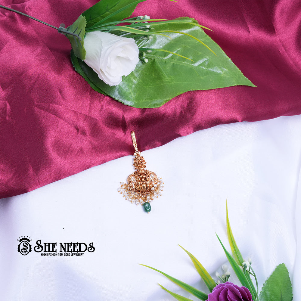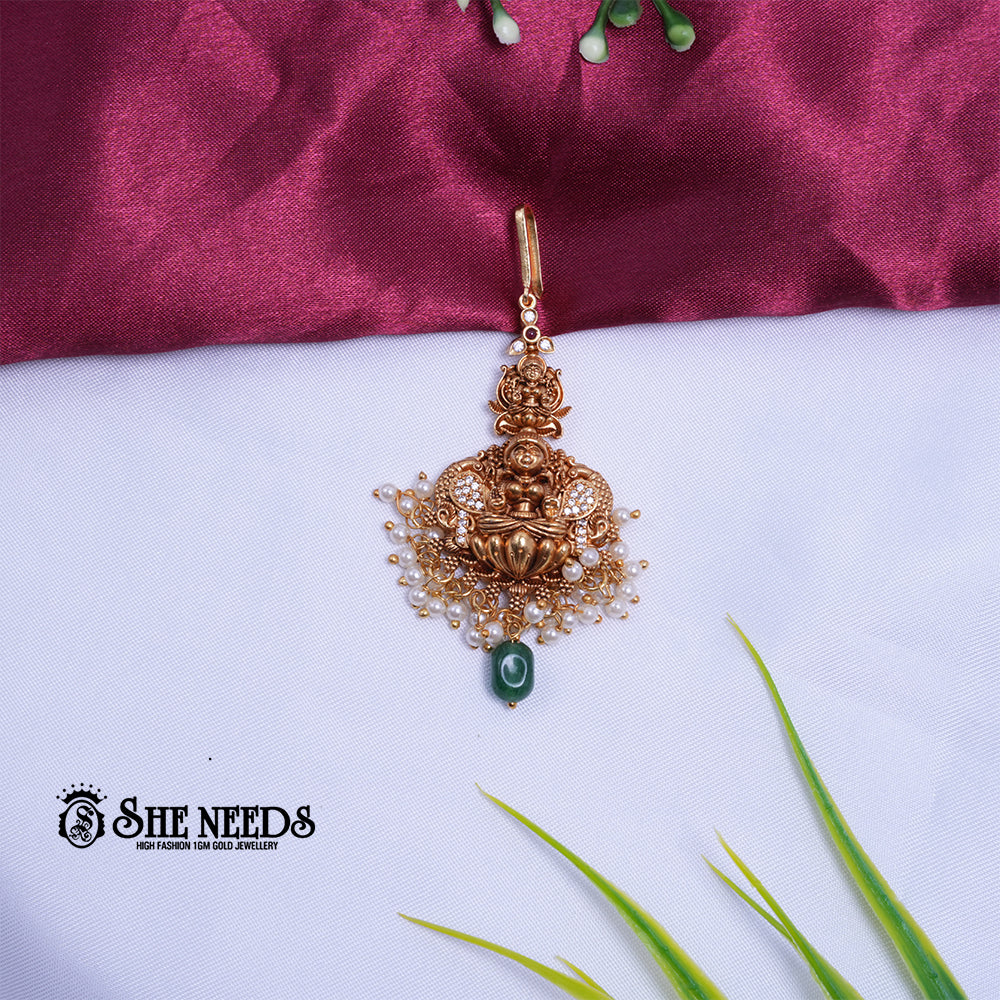 A stunning pendant showcasing the intricate Lakshmi motif, flanked by sparkling kundan work and adorned with elegant pearl clusters. Perfectly blending traditional design with luxurious detailing, this pendant elevates any ethnic ensemble.