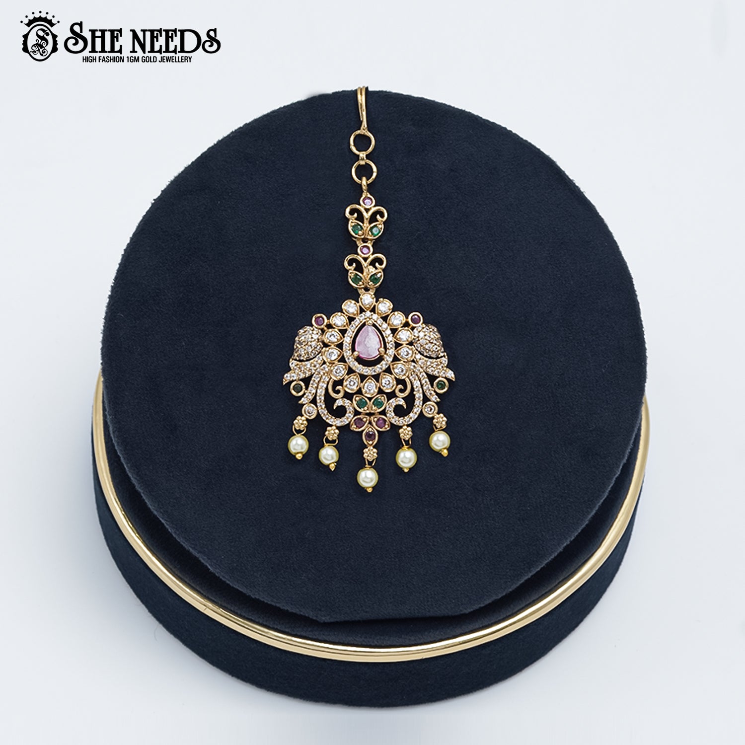 Product Name: Peacock Motif Temple Tikka with Pearls & Stones