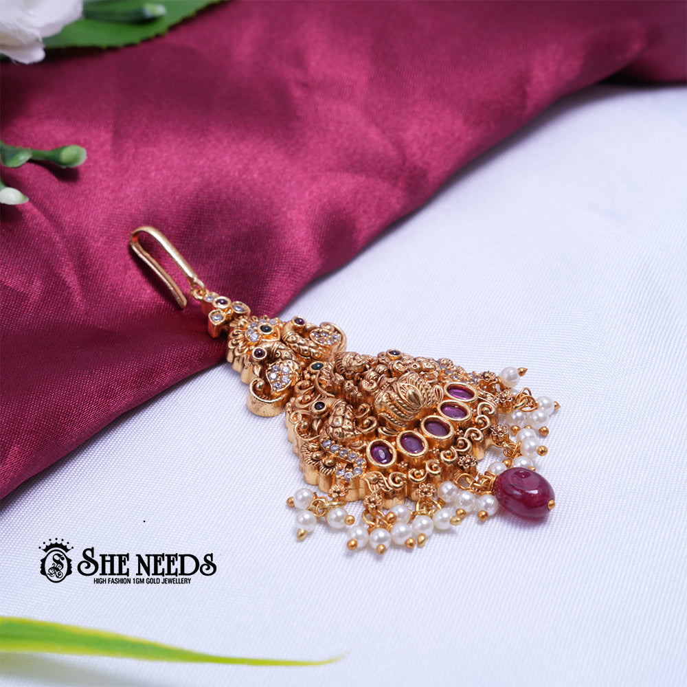 A lavish pendant featuring exquisite temple artistry, highlighted by circular ruby-hued stones and dazzling kundan accents. The finishing touch is a fringe of delicate pearls and a central ruby bead, making this an ideal statement for weddings or festive celebrations.
