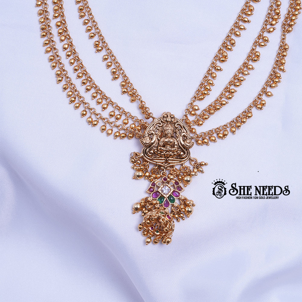 A statement temple necklace with three layers of bead hangings and a grand Lakshmi centerpiece. The lower pendant boasts a colorful floral design set with ruby, emerald, and kundan stones, finished with ornate drops for a regal and festive impact.