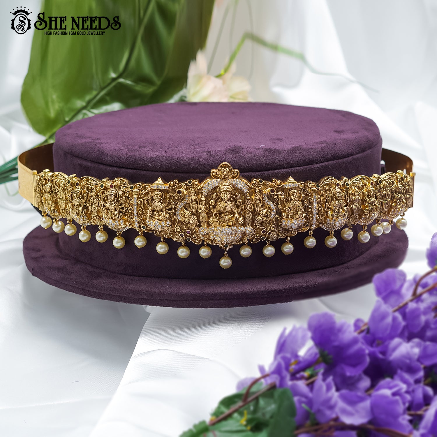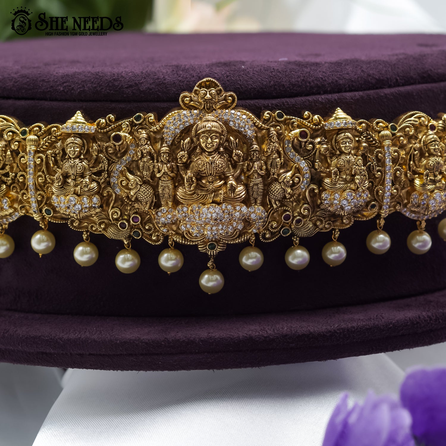 Bring home a piece of tradition with the Divine Lakshmi Temple Vaddanam. This stunning waist belt features multiple idols of Goddess Lakshmi, each designed with fine temple-style detailing. Embellished with pearls and CZ stones, it's a perfect match for bridal looks and festive attire.