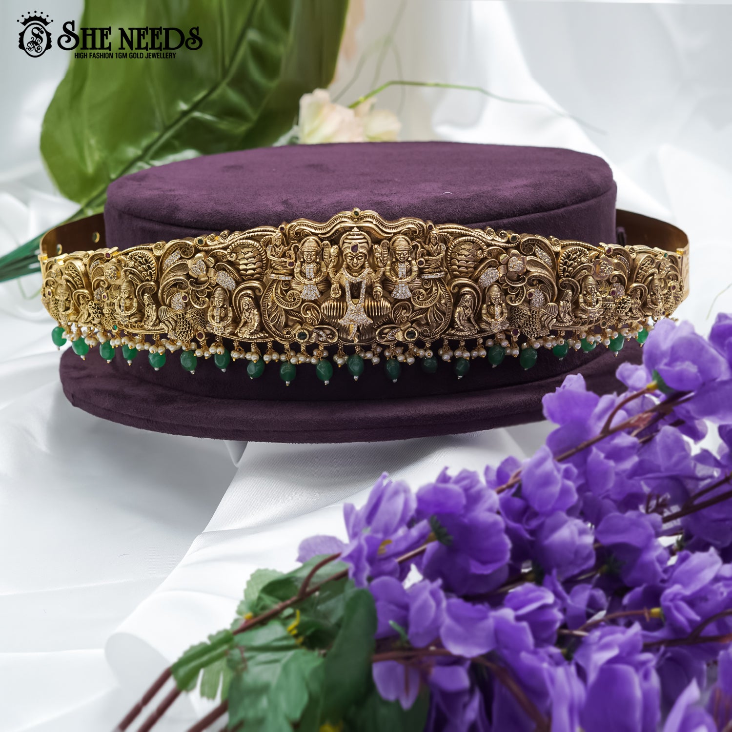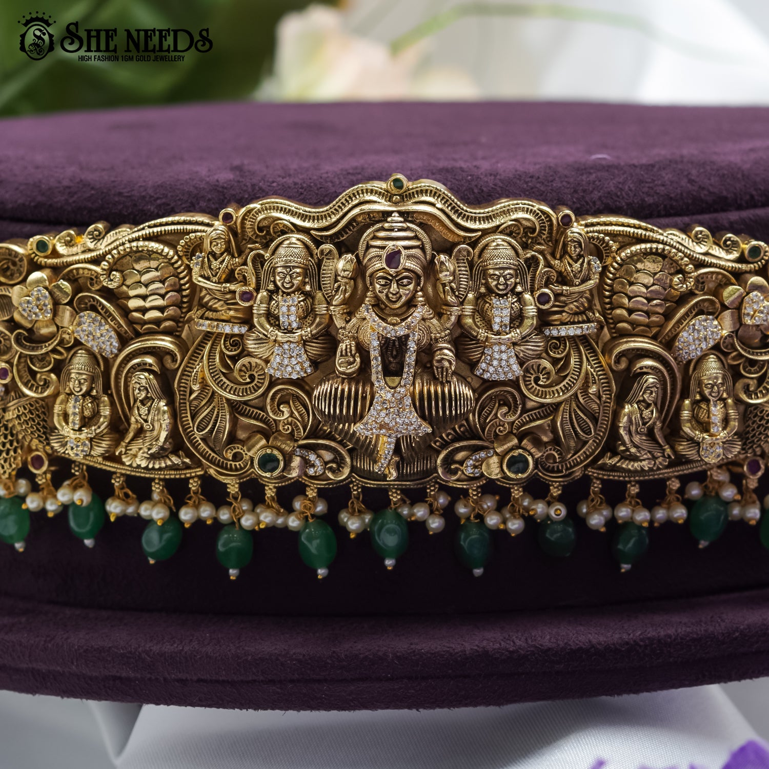 Elevate your festive and bridal look with the Grand Lakshmi Green Drop Vaddanam. Featuring Goddess Lakshmi in the center with detailed figures on each side, this waist belt is crafted in rich temple style. Finished with pearl and green bead drops, it brings a royal and traditional touch.