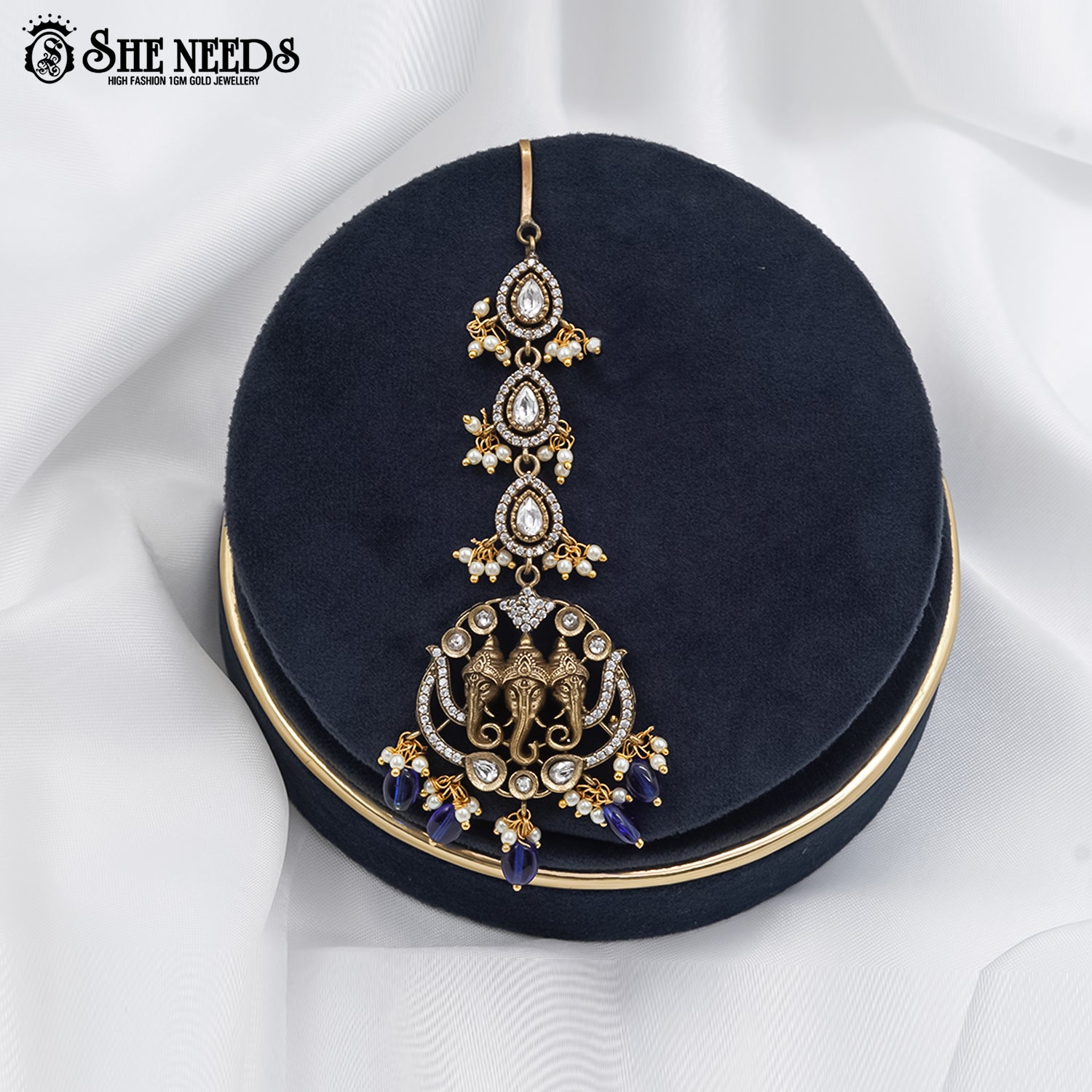 Celebrate tradition with a touch of mystique in the Midnight Blessings Ganesha Maang Tikka. Adorned with sparkling kundan stones and deep blue beads, this striking headpiece features a finely detailed Ganesha idol, bringing auspicious elegance to your festive ensemble.