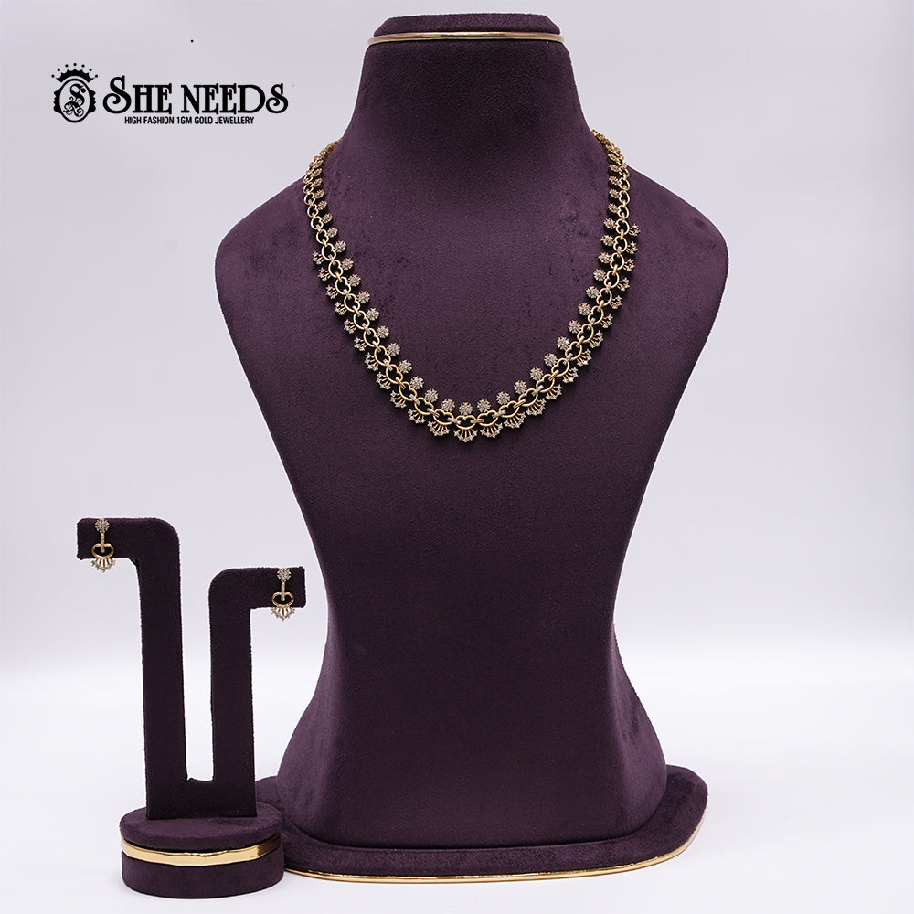 An elegant 1gm gold necklace set featuring floral motifs and intricate American diamond detailing, perfect for enhancing your traditional and festive wardrobe.