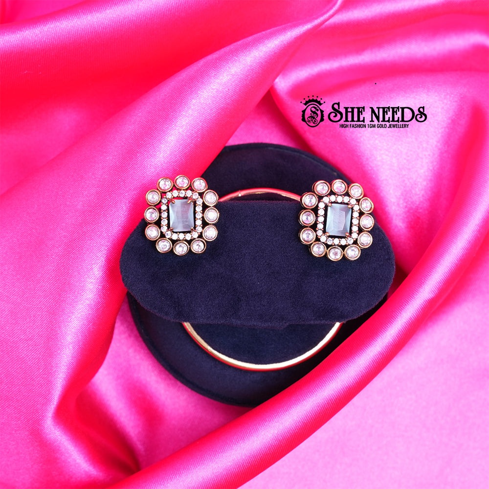 These luxurious studs display a large mint green rectangular center stone, encircled by a double halo of sparkling white CZs and set within an antique gold rectangular frame. Their regal style delivers both vintage grace and modern shine, making them a stunning choice for formal occasions or partywear.