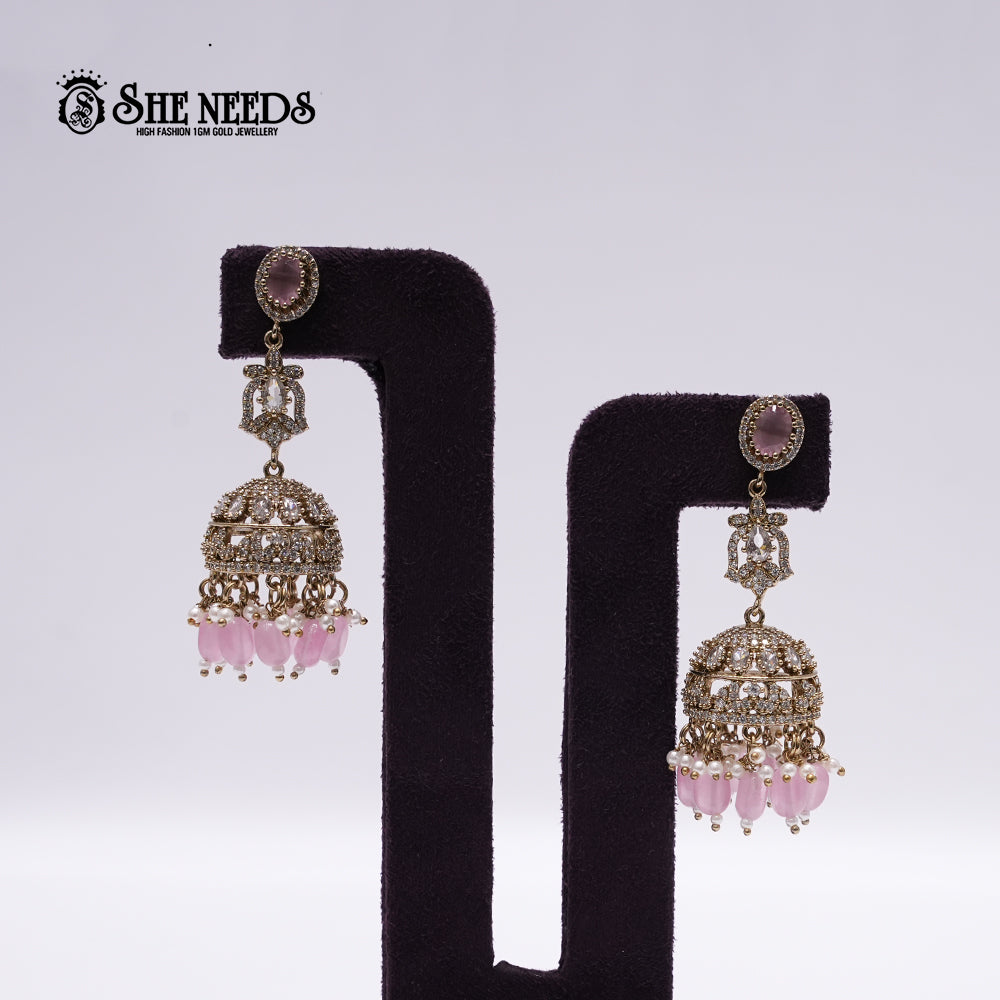 These stunning dome-style jhumka earrings blend fine American diamond work with pastel pink bead drops, adding a luxurious charm to your ethnic ensemble.