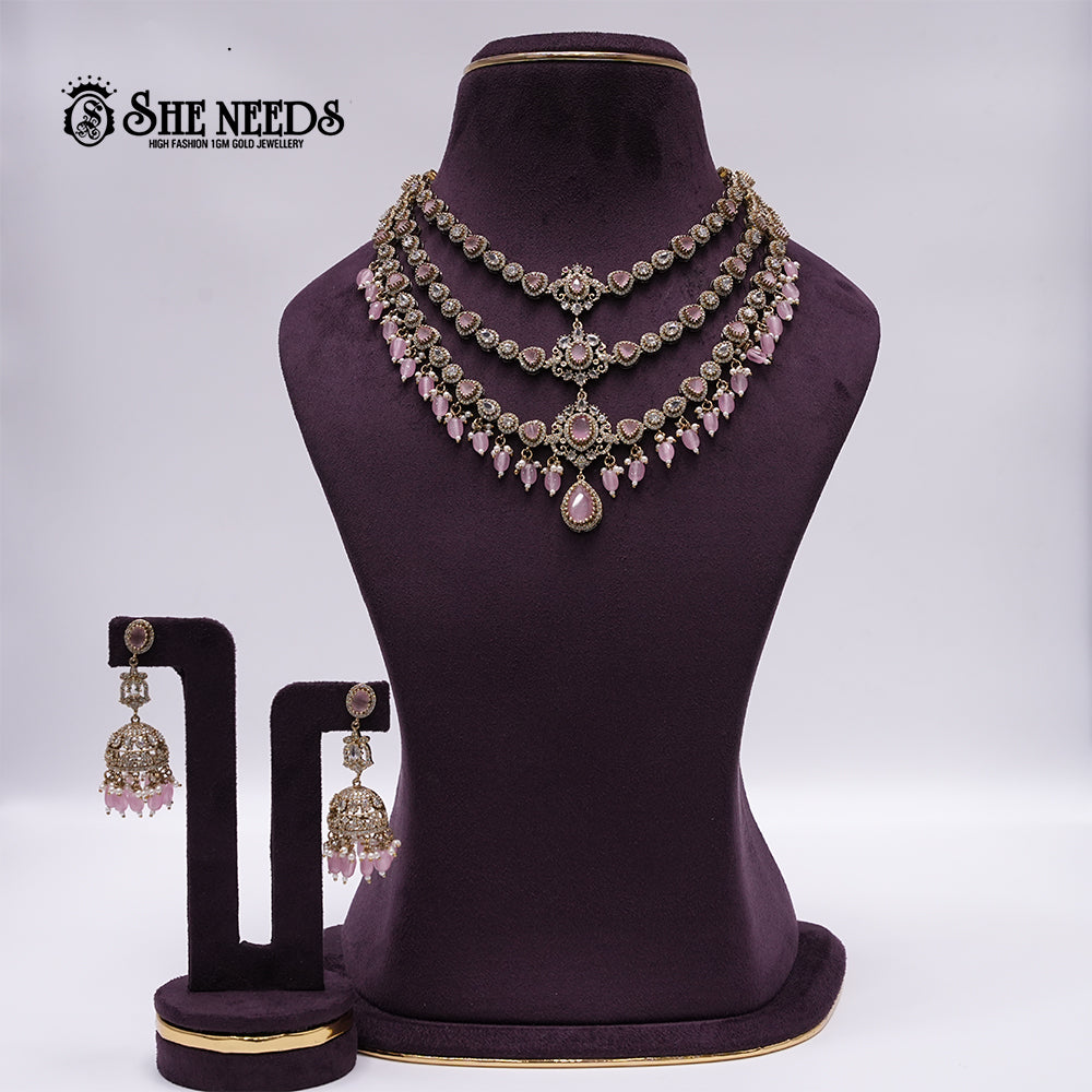 This three-tiered necklace set, crafted in 1gm gold finish, showcases dazzling American diamonds paired with elegant pink teardrop stones. A perfect harmony of tradition and luxury for bridal or grand festive wear.