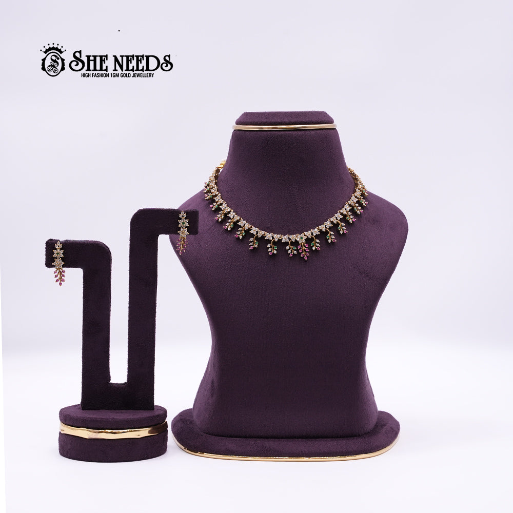 Elevate your ensemble with the graceful flow of the Crimson Petal Cascade Necklace Set from She Needs. Designed with a radiant gold finish and sparkling American diamonds, the necklace features cascading floral motifs with crimson pink accents, offering a stunning statement for any celebration or elegant affair. The intricate pattern beautifully balances tradition with contemporary finesse.