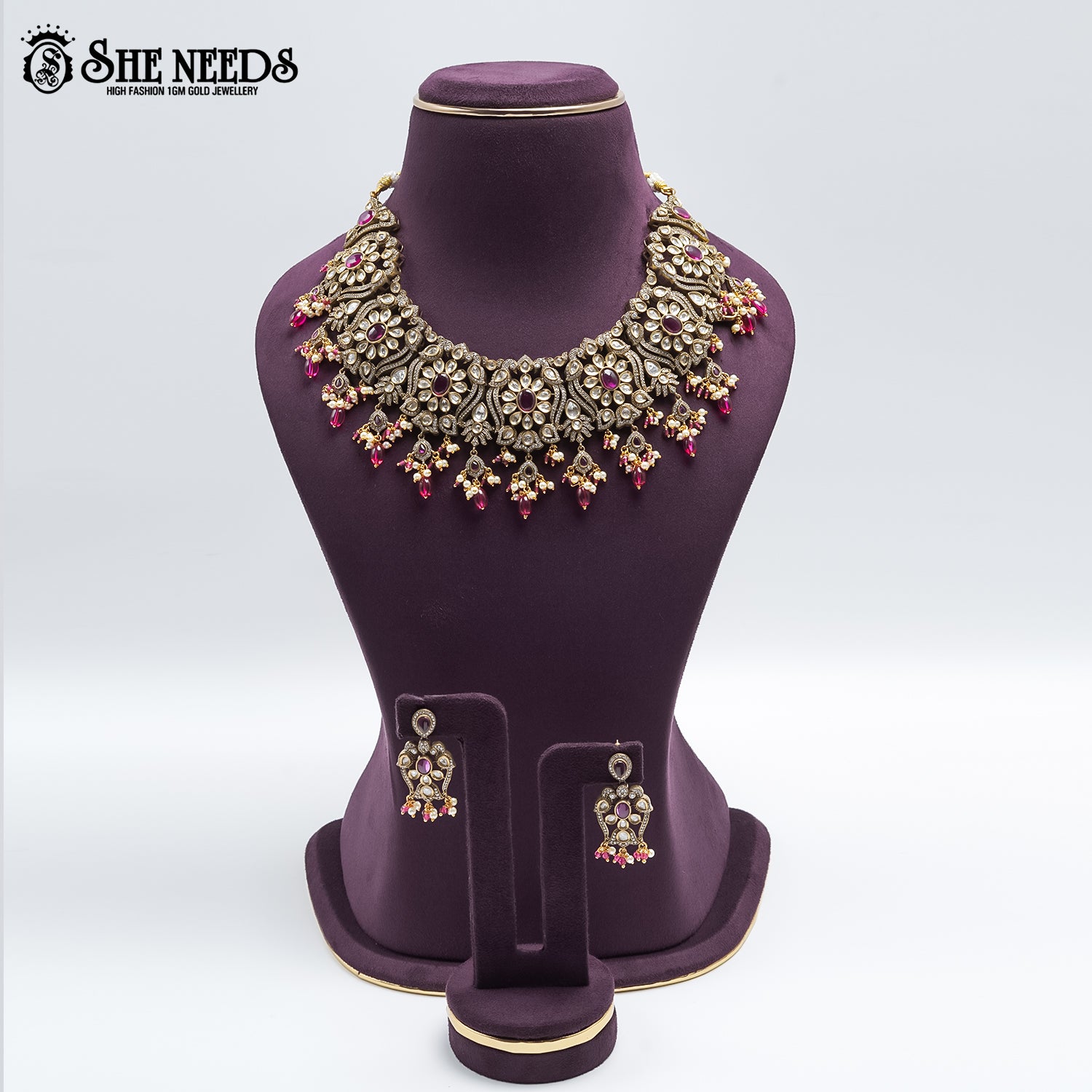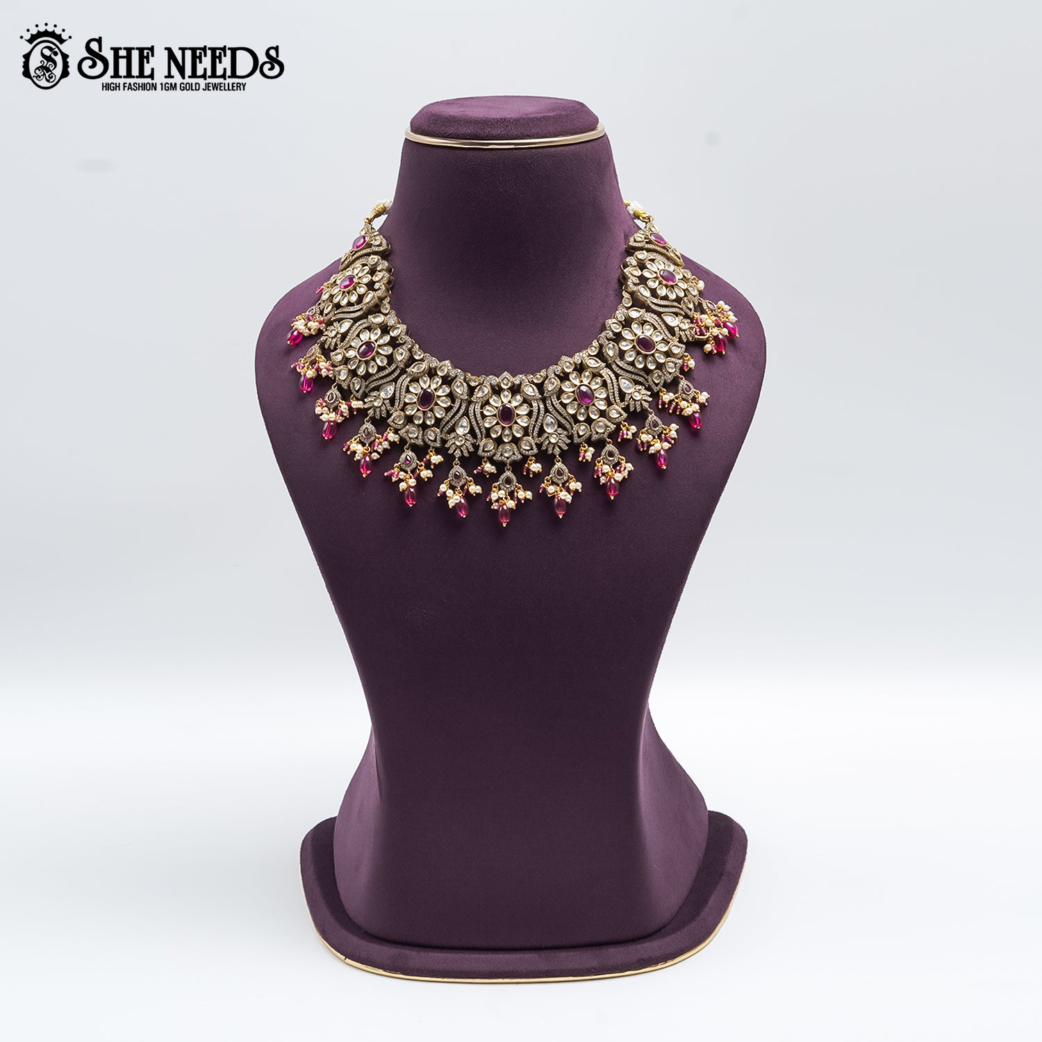 Exude regal charm with this exquisite necklace set, meticulously crafted to blend traditional Indian artistry with contemporary elegance. The necklace features an elaborate arrangement of floral motifs and shimmering kundan stones, adorned with pink and pearl drop accents that enhance its grandeur. Ideal for weddings, festive occasions, or cultural celebrations, this piece embodies opulence and timeless appeal.