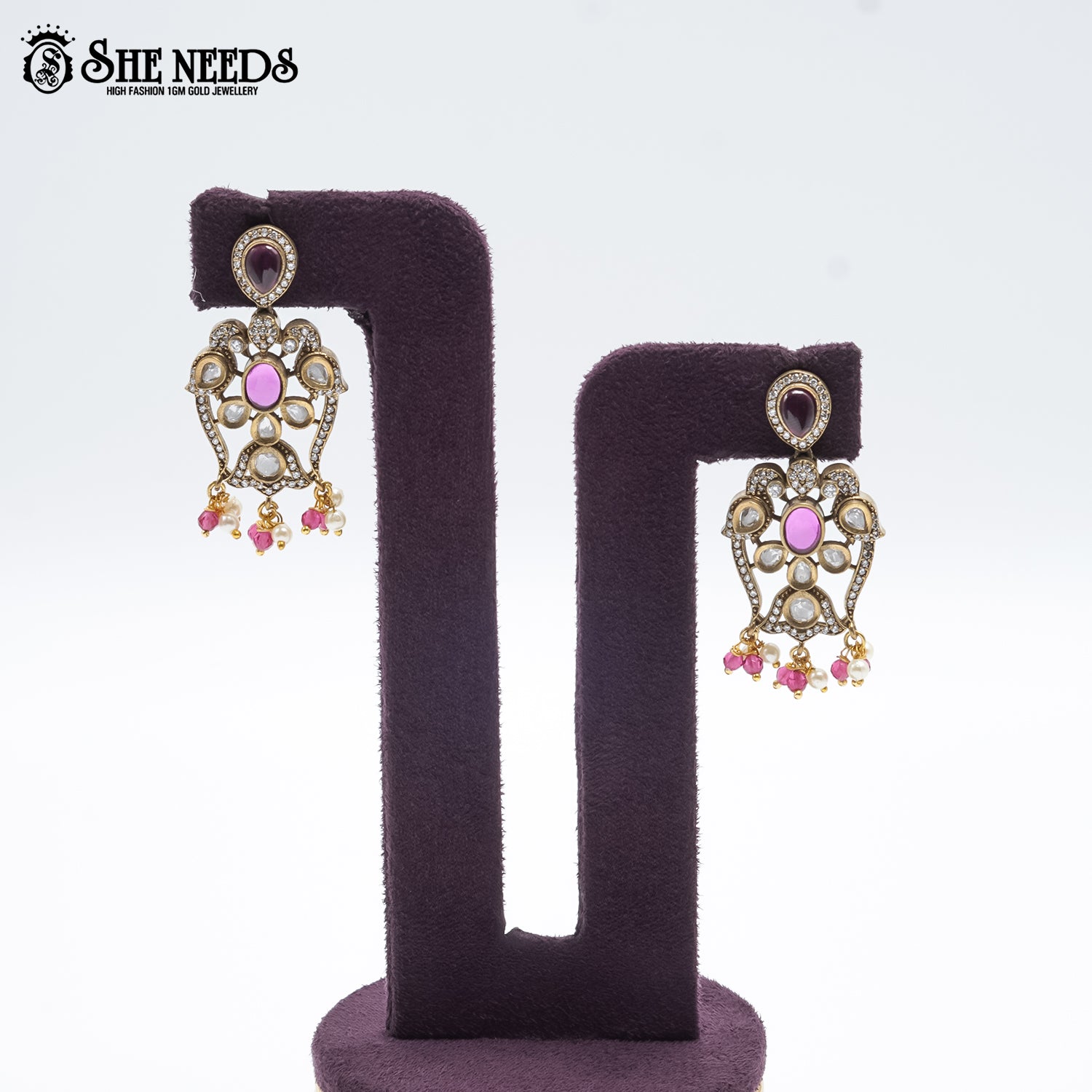 A stunning display of traditional craftsmanship, these earrings blend delicate pearl work with bold kundan elements. The graceful design is highlighted by a central pink stone, surrounded by intricate detailing and topped with a teardrop accent. These jhumkas are a versatile addition to your ethnic jewellery collection.