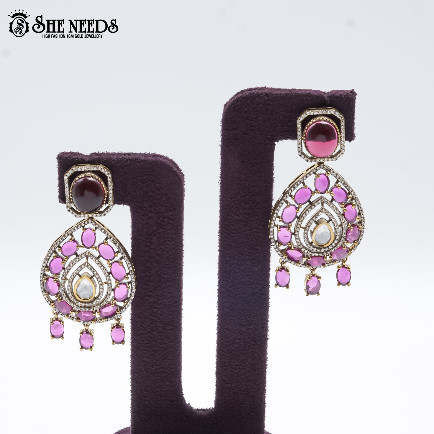 These stunning kundan earrings exude a bold charm with a rich ruby red stud top and teardrop-shaped dangles embellished with pink gemstones and traditional kundan settings. Finished with bead drops for a graceful sway, these earrings pair beautifully with the Ruby Elegance Necklace or wear solo for an eye-catching statement.