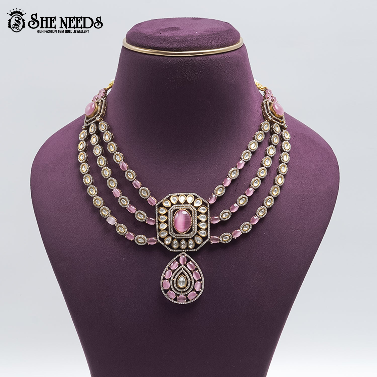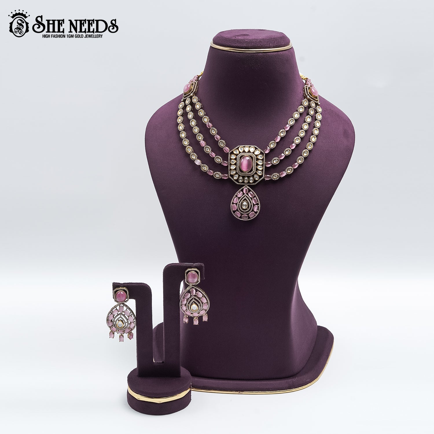 The Rosé Royale Necklace Set is a graceful blend of vintage elegance and soft feminine charm. Designed with three elegant strands of alternating kundan and rose-pink gemstones, this statement piece features a stunning oval centerpiece and pear-shaped pendant. Perfect for bridal showers, receptions, or any occasion where sophistication is key.