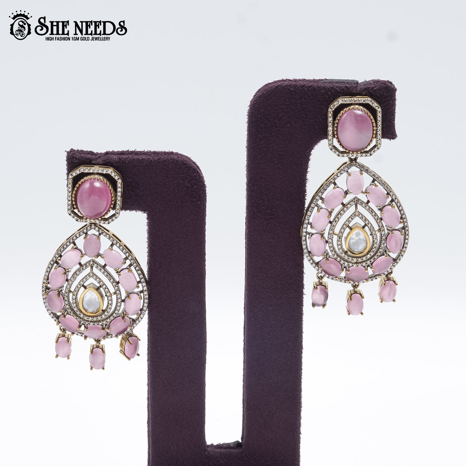 Finished with a pear-shaped pendant featuring kundan and pink gems