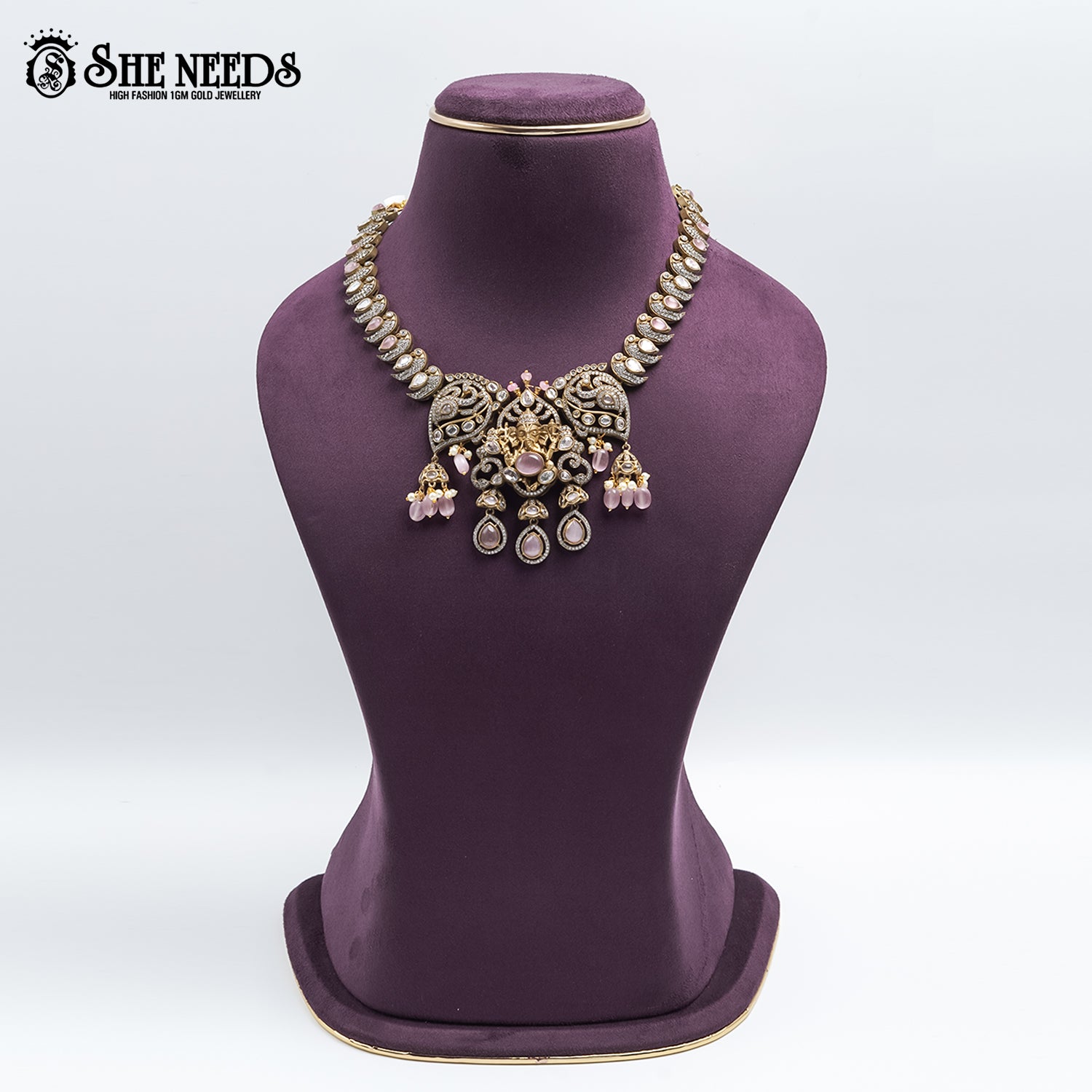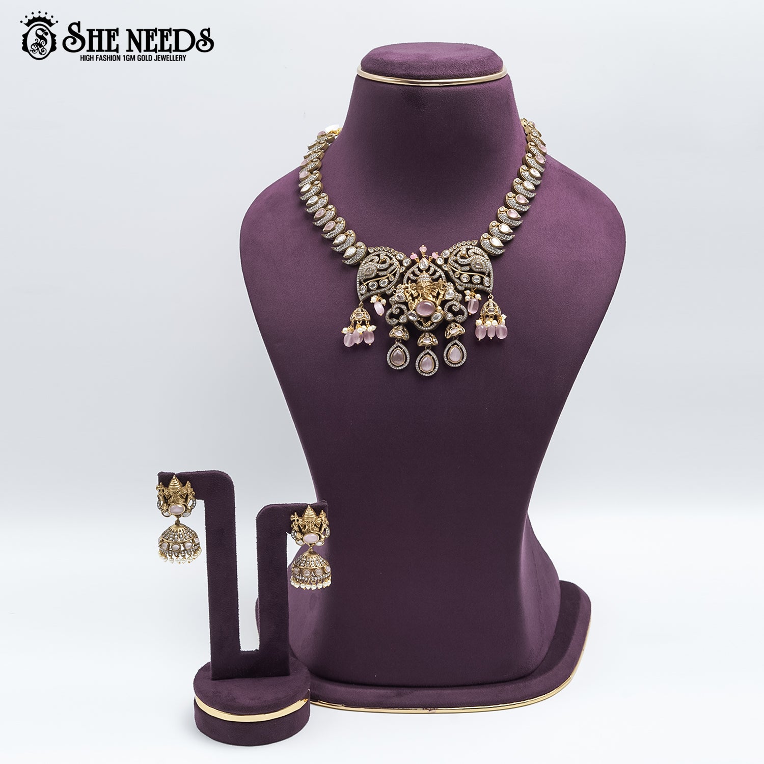 Step into elegance with the Royal Elephant Empress Necklace Set. Highlighted by a regal elephant motif at its center, this design symbolizes strength and grace. Crafted with a rich golden structure, embellished with shimmering stones and a deep green drop, this piece brings a blend of cultural pride and modern sophistication.