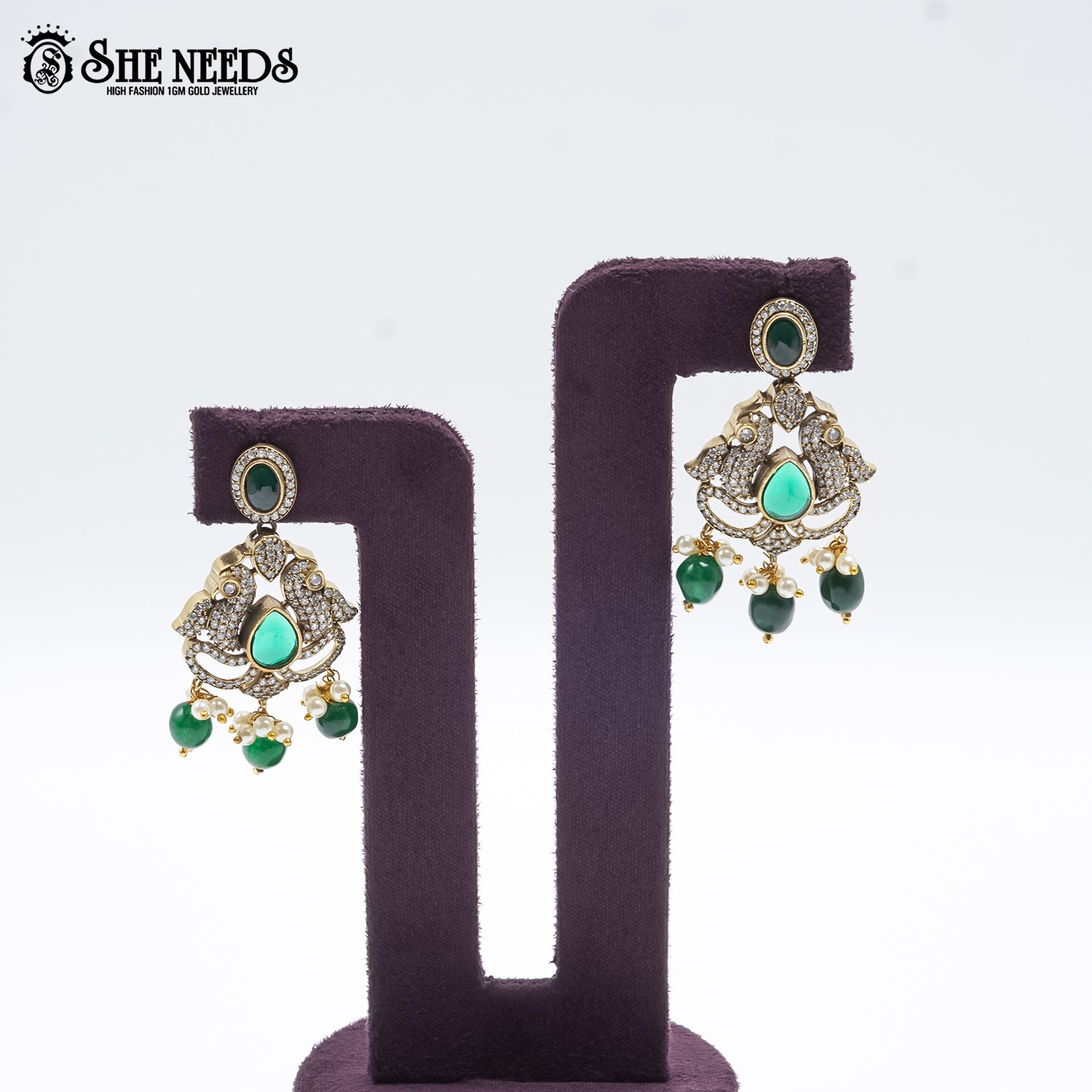 Inspired by timeless motifs, these earrings are designed to complement the Royal Empress Necklace Set. With dual-peacock-like shapes flanking a central emerald green teardrop, the earrings bring together the charm of heritage and the dazzle of celebration. Finished with pearl and green bead drops, they ensure you shine from every angle.