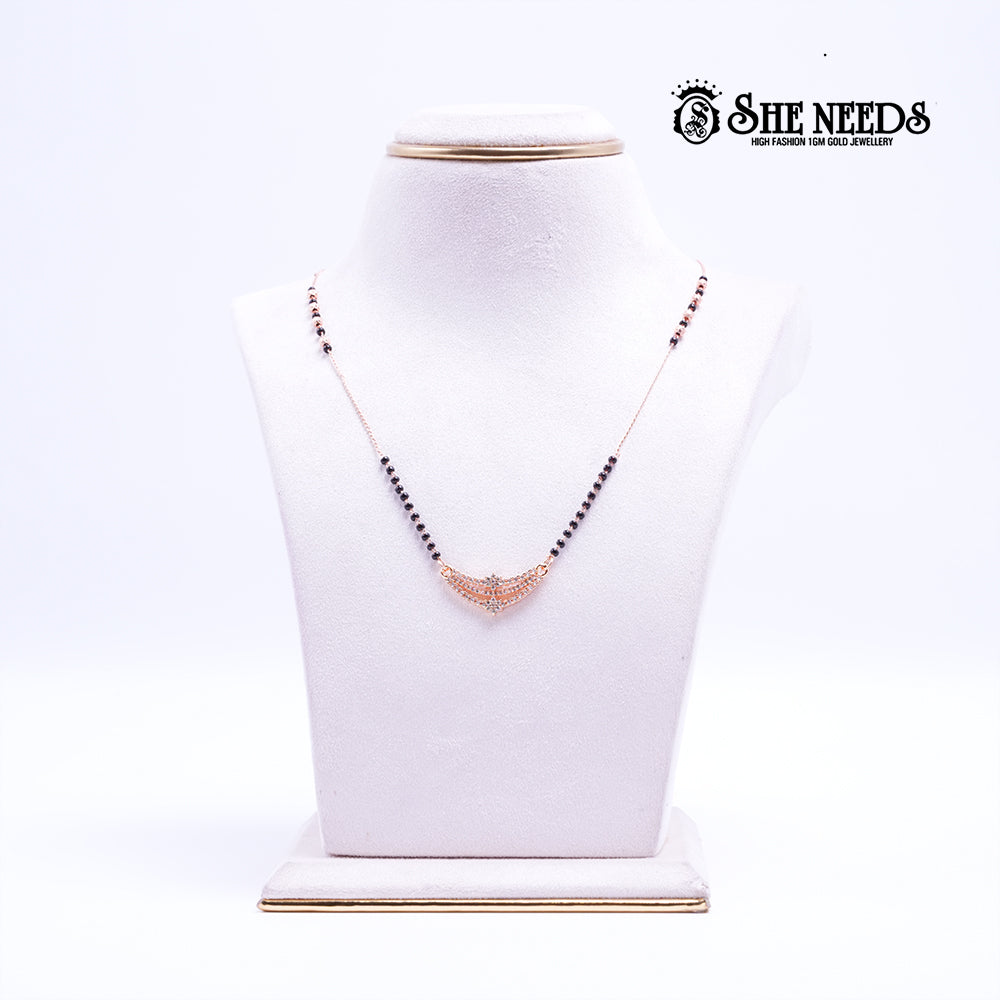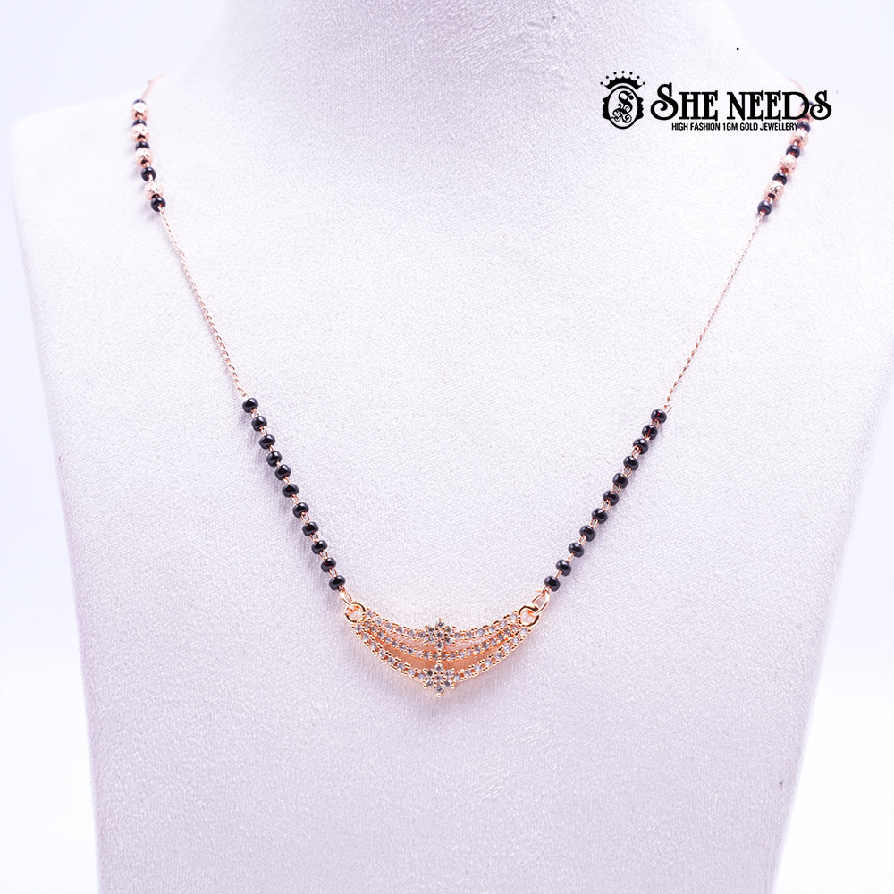 A chic short mangalsutra with a rose-gold finish, beautifully adorned with black beads and a uniquely layered, wave-inspired pendant studded with sparkling stones. This modern classic is perfect for daily elegance or festive flair.